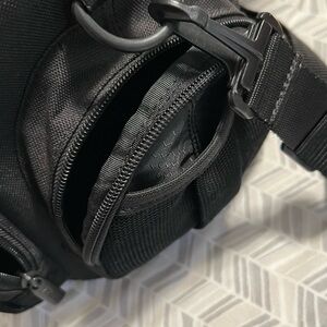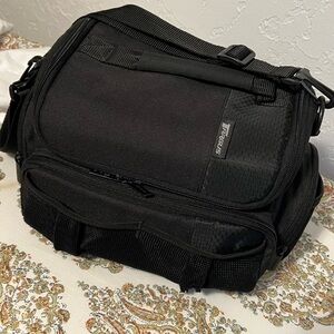 Can be on shoulder or cross body, lots of pockets for camera accessories, it never been used, one mesh pocket has hole in it, one last picture, it might be my poppy work.