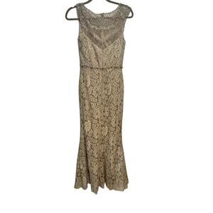 Cameron Blake Beige Neutral Full Length Lace Gown With Beaded Detail Women's 4.