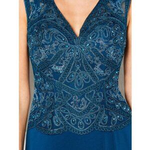 From Cameron Blake, a beautifully designed sleeveless jersey sheath with intricate metallic ribbon work and a beaded bodice with a flattering V-neckline. This style also features a flattering scalloped natural waistline, an illusion back with matching embellishments, and a side gathered skirt with a high-low hemline and a sweep train. Brand new, with tags. Style 219678. I am a top-rated seller and ship quickly!