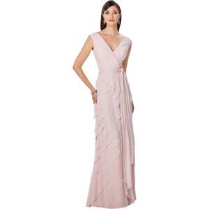 This lovely Cameron Blake ice pink dress is ideal for a wedding or formal event. This stunning dress features floating, fluttering chiffon layers that will make you feel like you're walking on air. The faux wrap bodice and large bow add a touch of sophistication, while the coordinating chiffon shawl completes the look. Brand new with tags.
