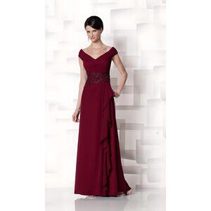 This richly-hued dress from Cameron Blake is sheer elegance. Made of chiffon, this style is a mock wrap dress with cap sleeves, tip-of-the-shoulder front and back V-necklines. Beautifully, figure-flattering ruched crisscross bodice is accented with asymmetrical hand-beaded lace midriff, side draped skirt with cascading ruffle and sweep train. Brand new, with tags. Style 213637. I am a top-rated seller and ship quickly!