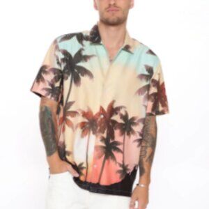 Lightweight short-sleeve button-down shirt featuring a palm tree silhouette print over a soft sunset gradient in peach, coral, and teal tones.