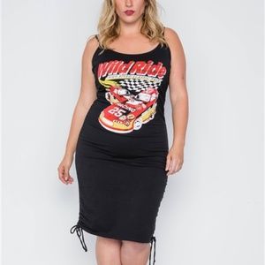 Junior Plus Size Dress featuring cami straps, graphic print at front, adjustable side strings, stretchy, midi length, unlined