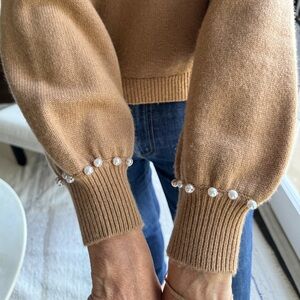 Sophisticated camel knit with pearl accents. Very soft, 100% Merino wool. Great condition, slight pilling in the front. Size small.
