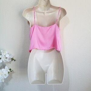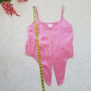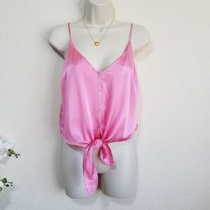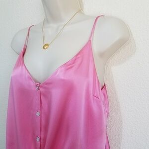 In excellent condition, adjustable straps, 100% silk, pink, front waist tie, lightweight, v-neck, front button down, high low, Barbie pink, size small.