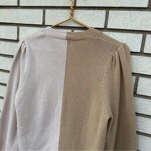 Chic and luxurious, this Cami NYC Maya Cardigan in size Medium features a standout neutral cashew colorblock design in cream and tan. Crafted from 100% merino wool, it offers supreme softness and breathability. Beautiful faux pearl and crystal-embellished buttons add a feminine, vintage-inspired touch. Blouson sleeves and ribbed cuffs create a flattering, romantic silhouette. A favorite sold at Revolve for $295, now offered in excellent used condition. No major flaws noted. Elegant, timeless, and versatile — perfect for styling up or down.