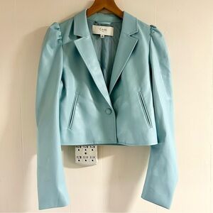 The Aliette is crafted from vegan leather in beautiful blue featuring a cropped slength, puff-shoulders, a single self-covered button closure, notched collar and side welt pockets.
