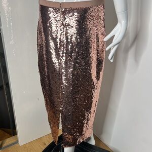 This is a gorgeous Cami Sz M 31” Rose Gold Sequins Zip Back Elastic Band Waist Skirt. Fits size 6-8. Skirt has some give so fits beautifully. Back slit. Back zipper with elastic band. Fully lined. All the sequins are in place. No issues. No odors. 30” waist