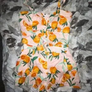 Printed cami top with matching shorts. Tangerine tropical pattern. Top has buttons with adjustable straps. Top size small. Shorts comes with matching belt. Shorts size 2.