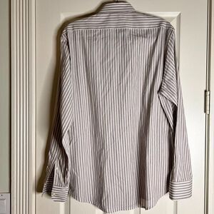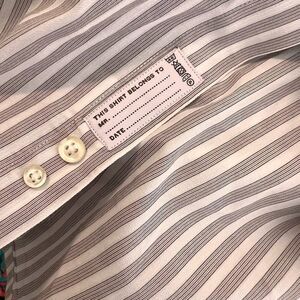 Crisp cotton and finely sewn. Extra buttons. Stripes read as tan- but I think they are composed of fine brown or alternating blue and maroon lines- so depending on what you wear with it, they will most likely reflect the color that is activated.