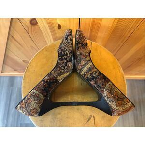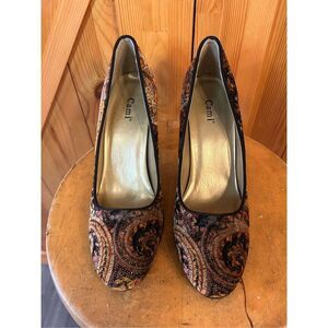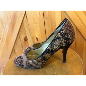 Cami high heels dress shoes Fabric upper leather Sole 8.5B Paisley design with rhinestones throughout 3.75” heel