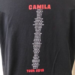 Camila Cabello Black Double Sided Concert Graphic T-Shirt Large Men's Unisex. Shirt is pre-owned. Please see all photos for visible condition. By threadshop. 100% cotton. Approximately 27 inches x 22.5 inches pit to pit. Some deodorant inside and minor on arm - start of possible pilling under arm but it doesn't look like it was worn or wash very much. RN 130648.