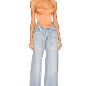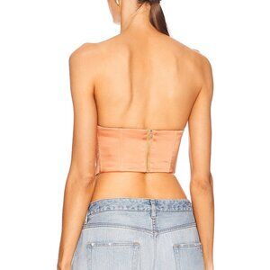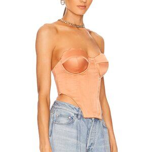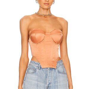 Self + SP: 53% viscose, 44% rayon, 3% SP.Lining: 90% polyester, 10% spandex. Made in China. Dry clean only. Exposed back zip closure. Corset top with underwire bra. Satin fabric. Revolve Style No. COEL-WS278. Manufacturer Style No. CCS349 S22.
