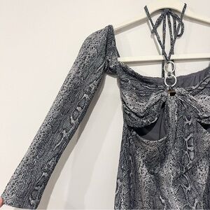 Chic snake print dress with long sleeves. Stylish and bold design. Perfect for a night out. Cutout details. Tie neck. Mini. Women’s size XS