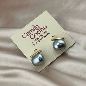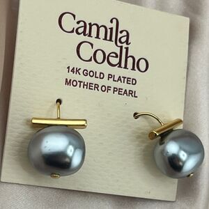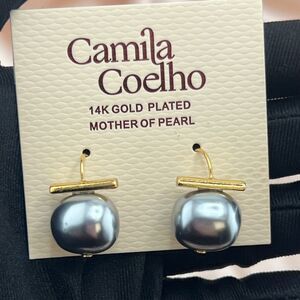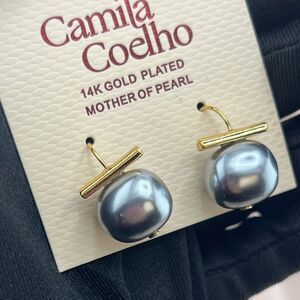 Elevate your jewelry collection with these stunning Camila Coelho earrings. Featuring a contemporary design with an elegant gray mother-of-pearl drop, these earrings are crafted with 14K gold-plated hardware, offering timeless sophistication.