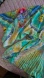 Stunning off-shoulder dress with a vibrant multicolor pattern. Features a mix of blue, green, and yellow hues.