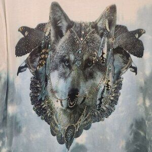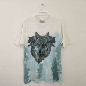 Please note that the shirt got stretched after washing so the side seams don't lay uniform at the side, they both slant left which results in the print skewing left (See last 3 photos). Otherwise in good condition and still lots of wear left!