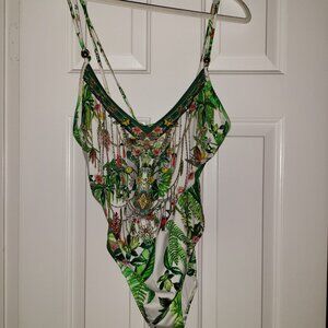 Two piece matching kimono w belt and one piece swimsuit, accentuated with stones. This lovely affluent 2 pc set will definitely turn heads. Sexy, flirty and elegant.