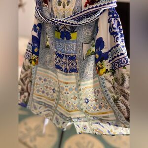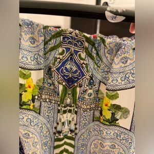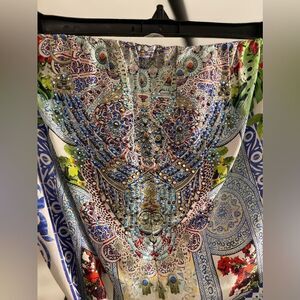 This stunning Camilla playsuit in the “Moonlit Mirage” print is a perfect addition to your wardrobe. Made from luxurious 100% silk, it features intricate embellishments and a vibrant blue and white design inspired by Moroccan tiles and florals. The playsuit is accented with sparkling crystals and includes a self-tie belt for a flattering fit. Designed in Australia and made with love in China, this piece embodies the brand’s commitment to elegance and craftsmanship. Perfect for a beach day, vacation, or special occasion!