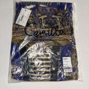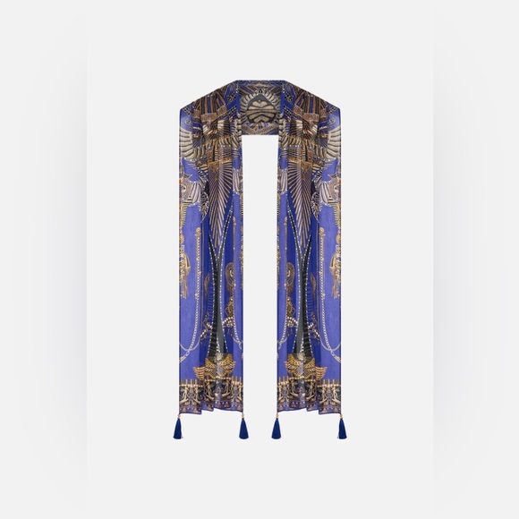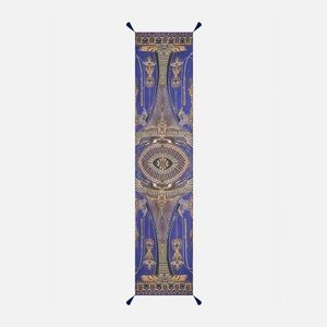 My Fair Pharaoh Long Scarf captures the intricate gilded artworks of ancient Egyptian gods and goddesses that shimmer against a regal blue. This luxury silk scarf showcases a sumptuous rectangular length in a beautifully bespoke print adorned with shimmering crystal embellishments. The custom tassel details add an opulent edge as you drape across your shoulders for evening elegance or wrapped around the neckline for luxurious layering. Explore more from the House Of The Sun collection.