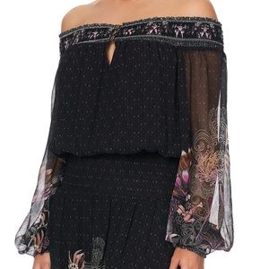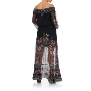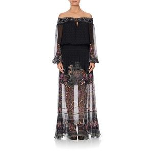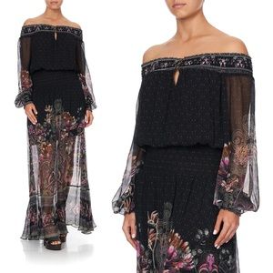 Romantic silk maxi dress, the Restless Nights Off Shoulder Shirred Dress poetically embraces native botanical beauty in an enchanting palette of fuchsia and lilac blooms that glisten against a southern sky. Crafted in pure silk, this occasion ready off-the-shoulder flowing dress features a shirred waist and neckline, button front closure, heavenly wide frilled hemline, sheer sleeves and scattered hand placed embellishments for a luminous shine. - Off Shoulder maxi dress - Full length - Floral paisley print - Shirred neckline, waist and cuffs - Sheer sleeves and skirt - Relaxed fit - Keyhole front with buttons - Ruffle hem - Crystal embellishments FABRICATION: 100% SILK Excellent condition, worn once!