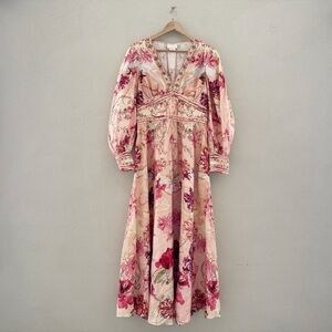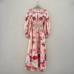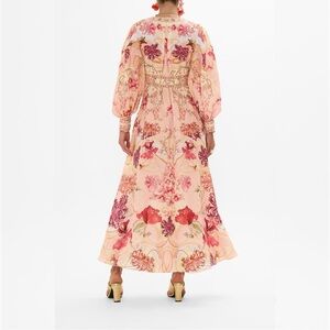 Camilla Shaped Waistband Maxi Dress Blossoms Brushstrokes Linen Romantic Pink L