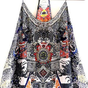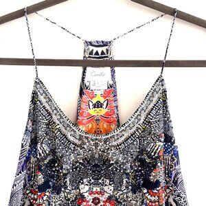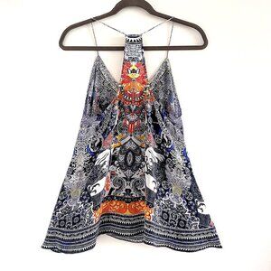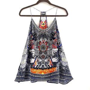This gorgeous top from Camilla has been crafted from lightweight printed silk and adorned with hand-applied crystals and beads. Features a flirty racerback shape, flared hemline, and thin spaghetti straps. The intricate design features a blend of navy blue, red, orange, yellow and white hues, making it a standout piece for any occasion. Size is a small. Note that the image with the model is the same style in a different print to show the fit and style. This top has never been worn.