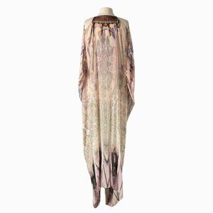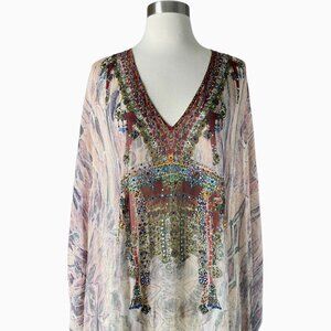 Crafted from pure silk with a fluid, ethereal drape, this Camilla kaftan showcases the brand’s signature artisanal detailing and hand-applied embellishments. The design features a multicolor marble-feather motif in soft pink, mauve, and sage tones, framed by a jeweled neckline enriched with Swarovski crystals and metallic accents. The silhouette flows freely with a relaxed tie-front option that cinches the waist for shape, highlighting Camilla’s luxurious resort aesthetic and versatile styling. Perfect worn loose over swimwear or belted for evening elegance.