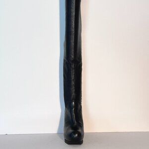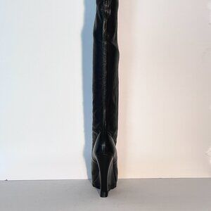 Super cool Camilla Skovgaard Over the Knee black soft leather boot. Her trademark sawtooth wedge bottom on a 4.75" wedge, and 1.5" hidden platform. Rounded tuck toe. 19" approx. shaft height, with. 15" opening. I had shoe guy put an elastic gusset at the tops so they actually fit over a human sized thigh, and stay up as well. Bottoms are made of a flexible rubber. The leather is very soft, and in the last photo you can see nail marks from putting them on (my bad). Otherwise, in excellent shape, no other leather flaws except some minor denting along the wedges. No wear on the soles, probably wore these a few times. They fit a solid 8 or 8.5 well.