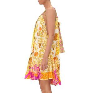 Camilla 'Squid Squad' Printed Silk Mini Dress featuring an exquisite print of gold baroque cascades, vibrant octopi wrapped in neon-dipped fuchsias and ornaments of the sea.