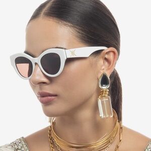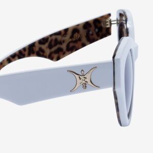 The Duchess redefines a classic elegance. Handcrafted using luxurious custom laminated acetate, this style embodies a hint of leopard delight on the inner complete with a bold white frame front. Featuring moulded nose pads for an impeccable fit, these sunglasses showcase quality gold wire core and hinges to ensure both style and resilience. Equipped with bold smoke mono lenses, these sunglasses ensure exceptional clarity, ideal for sunny adventures. Iconic Camilla pin hardware features on both temples handpolished in gold.