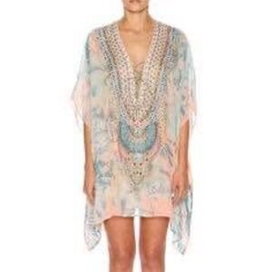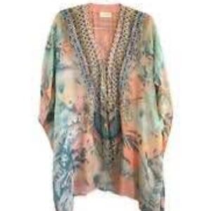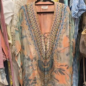 peach and aqua, silk kaftan, embellished dress, floral print, vacationwear, resort style, boho chic, sparkly, lined, flowy