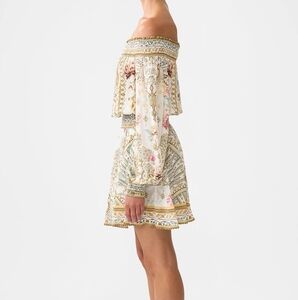 The Ottoman Dynasty Off Shoulder Short Dress is a handcrafted silk silhouette designed by our in house artisans. Reimagined in an exclusive limited edition print, our off the shoulder mini dress features a shirred waistband, neckline and cuffs for an adjustable, cinched fit. Feminine blouson sleeves and a flared hemline add soft volume, whilst crystal embellishments add subtle sparkle.