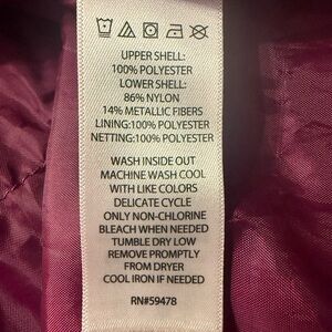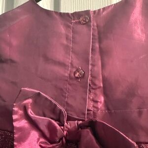 Camilla toddler dress in eggplant/purple color with capped sleeves. Bottom part of dress has a metallic look & 3 roses-has lining & a second lining with netting at bottom. Back has two buttons & a Velcro closure under bow. Beautiful dress!! Would be perfect for an Easter dress!! Size 4T NWOT Uppershell 100% poly Lower Shell 86% Nylon 14% Metallic fibers Lining 100% Poly Netting 100% poly. P2P 12 length 23 SFPF HOME