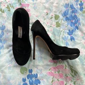 Gorgeous black suede heels with slightly iridescent heels and trim on inner soles. In good pre worn condition. Inside right soles has some mark towards the ball of the foot. And heels have some indents but not scratched through the material. 4” heel and about a 1” platform.