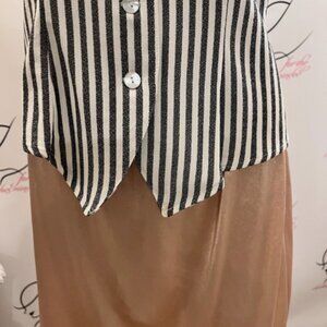 Camille Claudel. Size Small. Short Sleeve. Gray White Stripe. USA. Shoulder to hem 22.5" asymmetrical. Sleeve 9.5". Bust 19/38". Dry clean. Shoulder pads - easily removed.