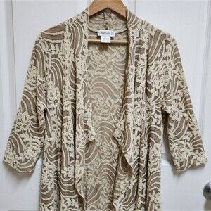 Camille & Co Cardigan Sweater Womens S Cream Tan Embroidered Floral Lace Swirl Mesh Open Longline Boho Kimono Soft Flowy Loungewear Casual Office Travel Feminine