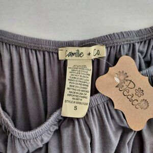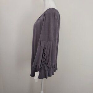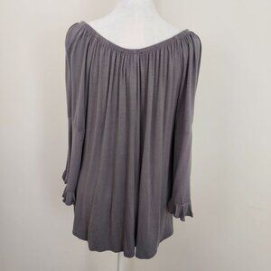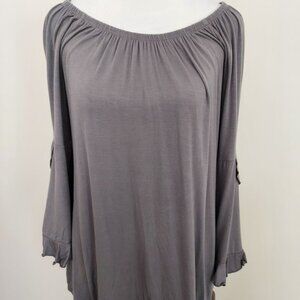 Size small Camille & Co Off Shoulder Ruffle Sleeve Top. 95% rayon 5% spandex. Steel gray color. Pit to pit 19" Top length 24". This top is brand new and has never been worn