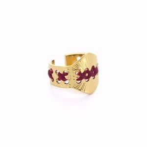 This adjustable ring, made of gold covered-brass, comes in black and burgundy.