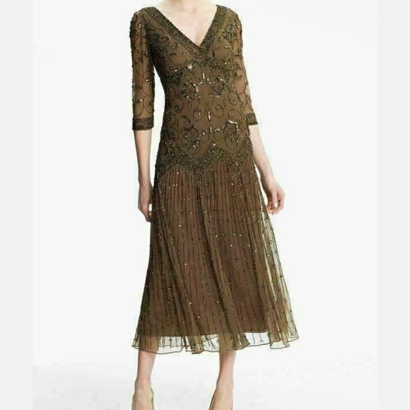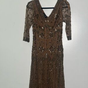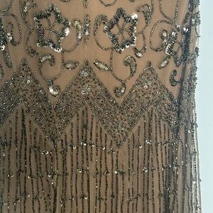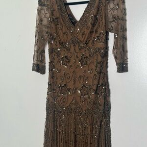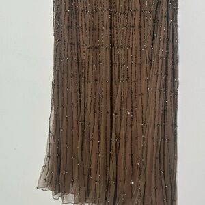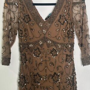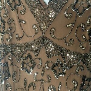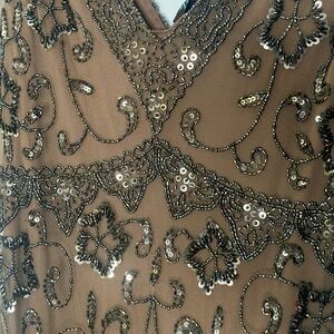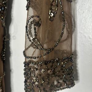 Camilo La VIE beaded v neck midi dress sheer side zip v neck in black some beads missing please see pictures brown armpit to armpit is 16 inches shoulder to hem is52 inches