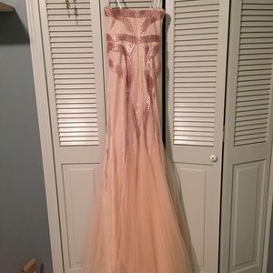 I wore this once for my senior prom. It's still in great condition. It has not been altered in anyway. It is a peach/tan color with lace detailing. This dress was very expensive so I am firm on the asking price but feel free to give me offers!