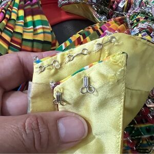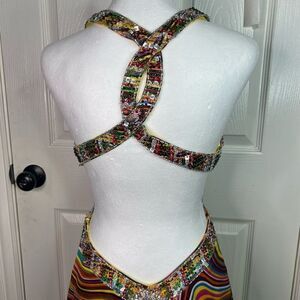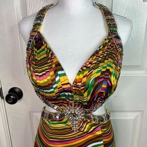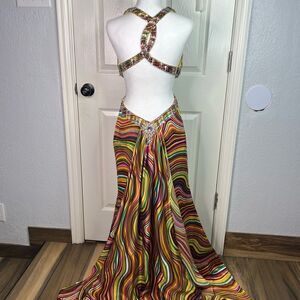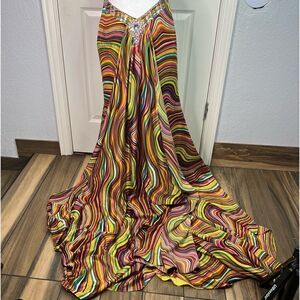 Cocktail/Prom dress: plunge neckline, fabric gathered by the breast area, color: multicolor rainbow, open back, beaded detail, open waist sides, zipper closure side skirt and top has hook & loop closure, extra long maxi length, long back train, front long slit cut, lined, fabric content: 100% polyester. Preowned no tears, stains, or major rips; has one small rips, some beads missing by the hips, and on the closure hook and eye one is missing. Please see pictures for details.
