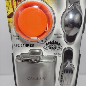 Camillus 4pc Camping multi-tool fork folding cup and stainless steel flask Set
