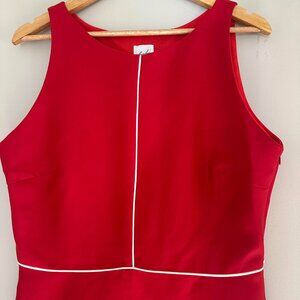 Sleek and feminine, this sleeveless A-line dress is elevated with scalloped hems and contrast piping details for a polished, modern finish.