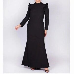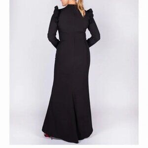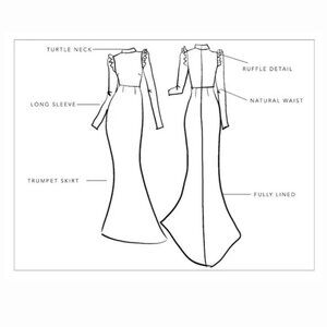 Turtle neck, long sleeve, shoulder ruffle. Stretch crep fabric. Invisible zipper in back. Fully lined and bra friendly.