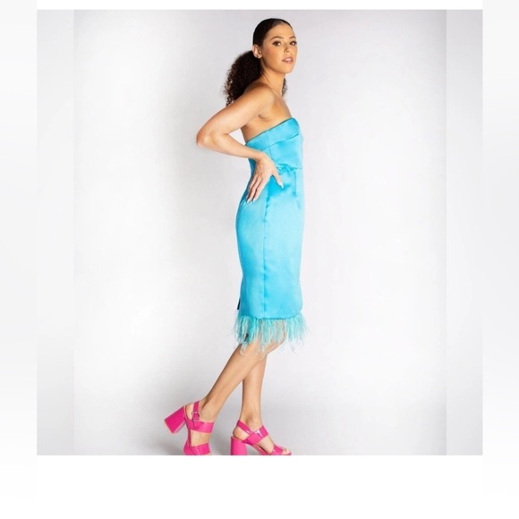 Step out in style with this elegant blue strapless dress. Featuring a chic ostrich feather trim detail, this dress is perfect for any special occasion. Pair it with your favorite heels for a stunning look or check out my feather cape Robbin heels!