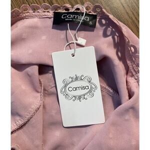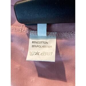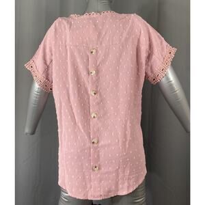 Camisa Blouse Women's Small Pink Swiss Dot Lace Accent Button Back Short Sleeve