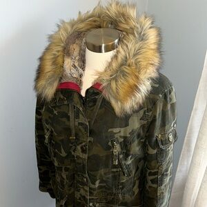Beautiful and Warm 1 Madison Expedition Camouflage Winter Jacket. Fur lined Hood. Zip and Snap Front. Inside and outside Pockets. Size Large.