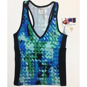 Lino Fitness scoop neck tank with racerback tank. Contrasting piping and wide thick side panels for a slimming silhouette.