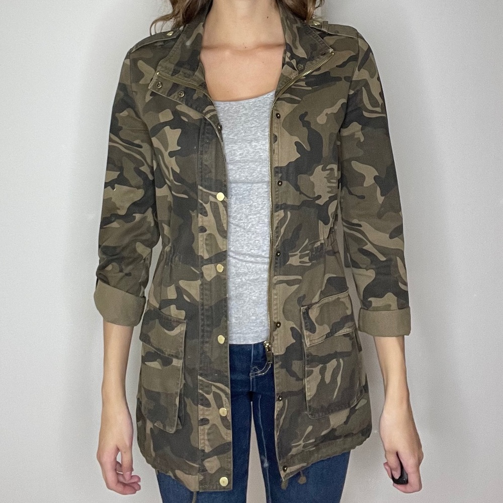 Camo jacket that has rollable sleeves and zips up and buttons up.